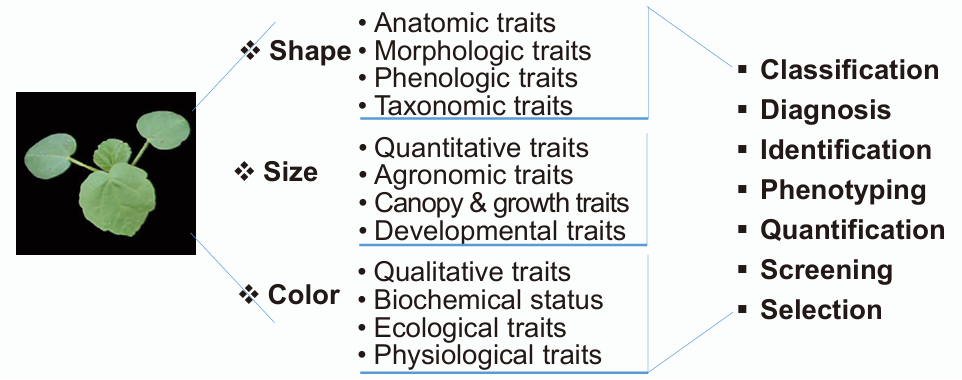 Recently, a new scientific field called “Plant Image Science” has emerged. Plant image science is a branch of science that uses imaging techniques and image analysis methods to capture, process, and analyze plant images for plant and crop research and agricultural management (Noh and Kim 2018). Although its application appears to be confined to agriculture, it has virtually no limitations as long as plant images are used directly or indirectly. Compared with plant phenomics, plant image science is broader and more scalable in terms of both concept and scope. While plant phenomics mainly focuses on plant phenotyping for plant genomic understanding and plant breeding, plant image science encompasses plant phenotyping, the diagnosis and remote sensing of individual plants, plant communities, vegetation, and living organisms (for example, microorganisms and insects) in natural and agricultural environments. Plant images contain information about the shape, size, and color of plants (Fig. 1). Information on plant shape, including anatomical, morphological, phenological, and taxonomic traits, can be extracted from plant images using image analysis. Various quantitative traits related to plant shape such as growth, development, and agronomic traits can also be obtained. Qualitative traits related to plant color, including biochemical and physiological traits, can be extracted from plant images captured using different spectral imaging sensors. Individual and combined traits can be used for various purposes such as identifying and classifying plant species, crop varieties, insect pests, plant pathogens, and weeds; diagnosing plant responses to biotic and abiotic stresses and assessing plant and vegetation health; phenotyping plant and crop growth and agronomic traits; screening and selecting crop lines in breeding programs and pesticidal compounds in new pesticide discovery and development; recommending crop and field management practices; and remote-sensing of plant and vegetation in agricultural land, forestry and natural environment.